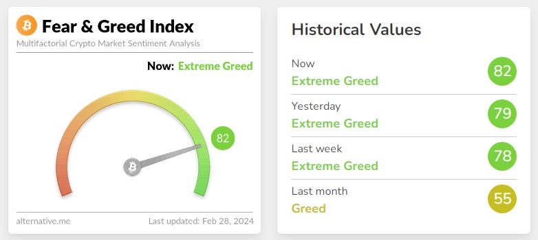 We’re in extreme greed as the markets — BTC, the S&P 500 and the NASDAQ - keep soaring in the overall macro.